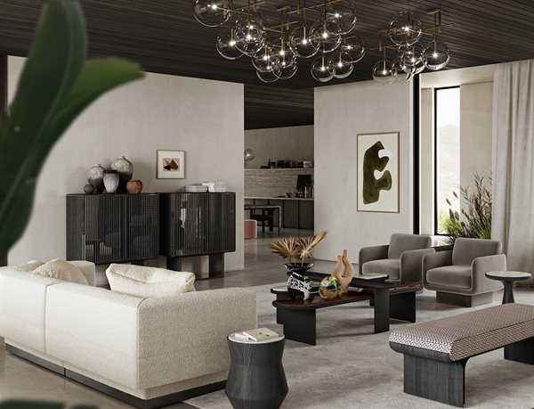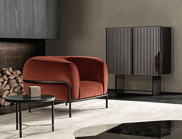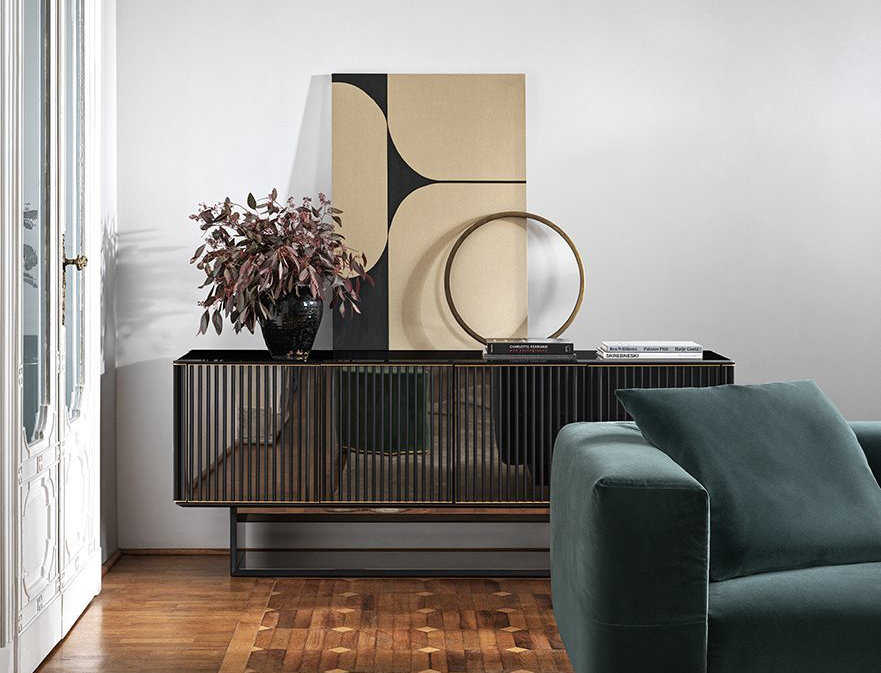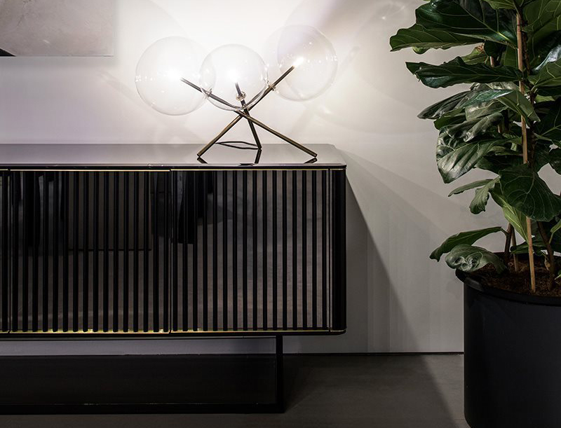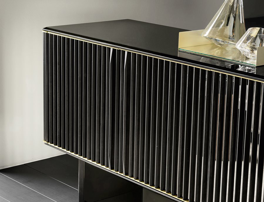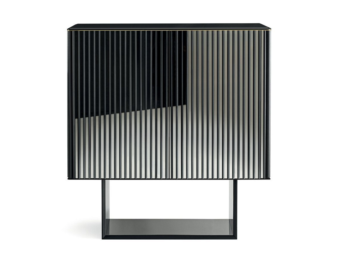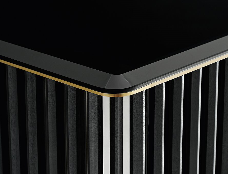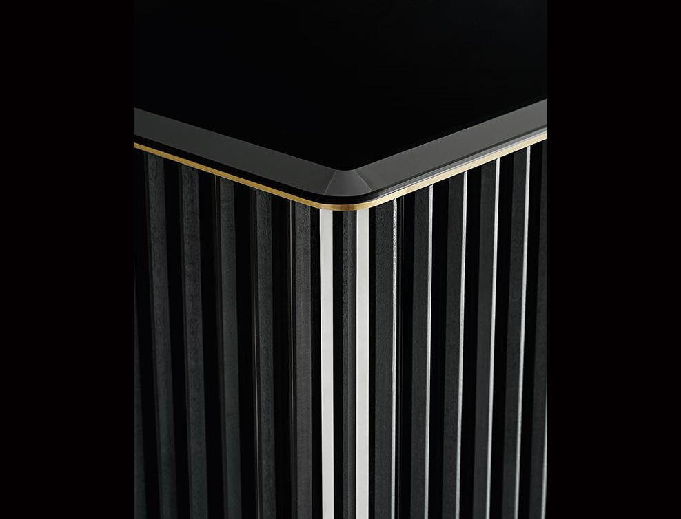 Wooden unit covered by “supermirror” stainless steel in the black chrome finish with black stained open pore solid wood strips.