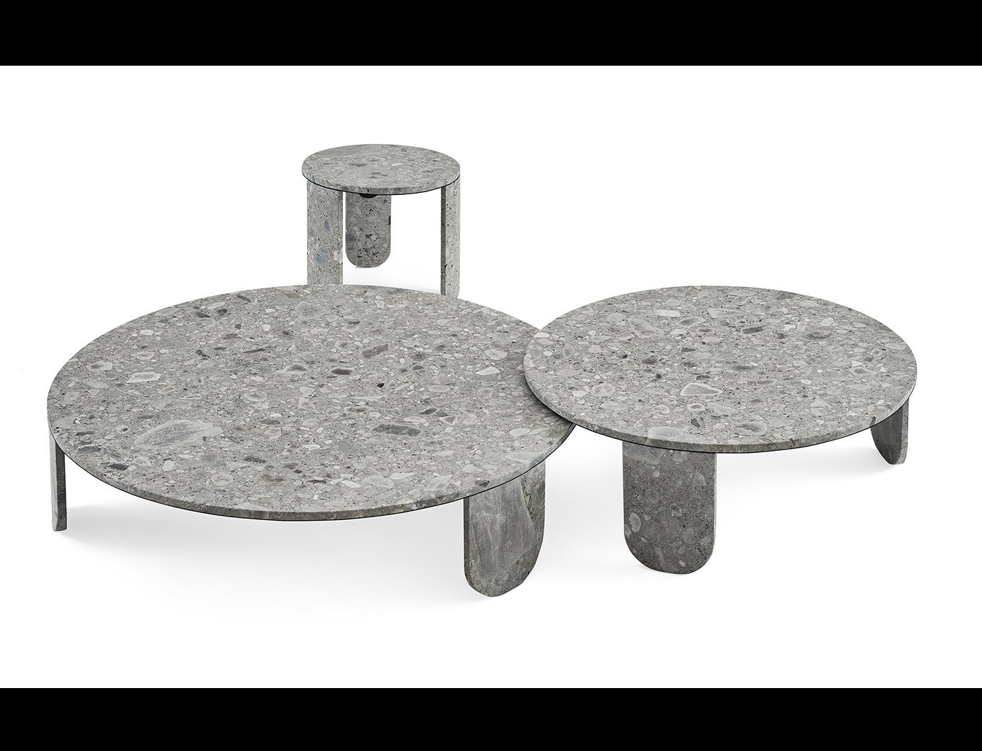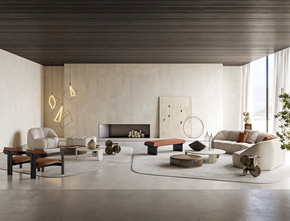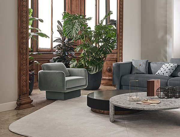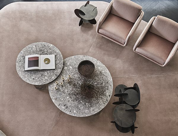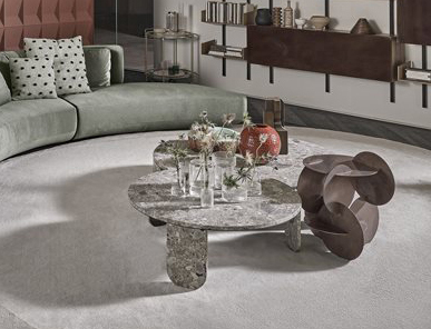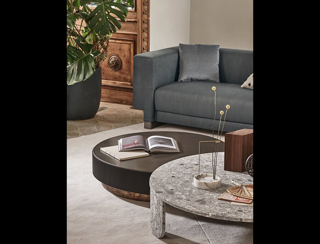 Coffee table in brushed Ceppo di Gré® with “dark” hand burnished metal details.