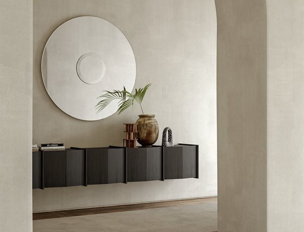 Suspended unit in black open pore stained ash or glossy or opaque lacquered wood.