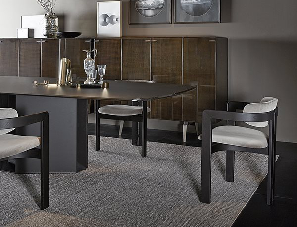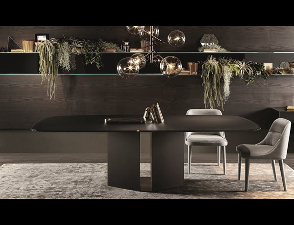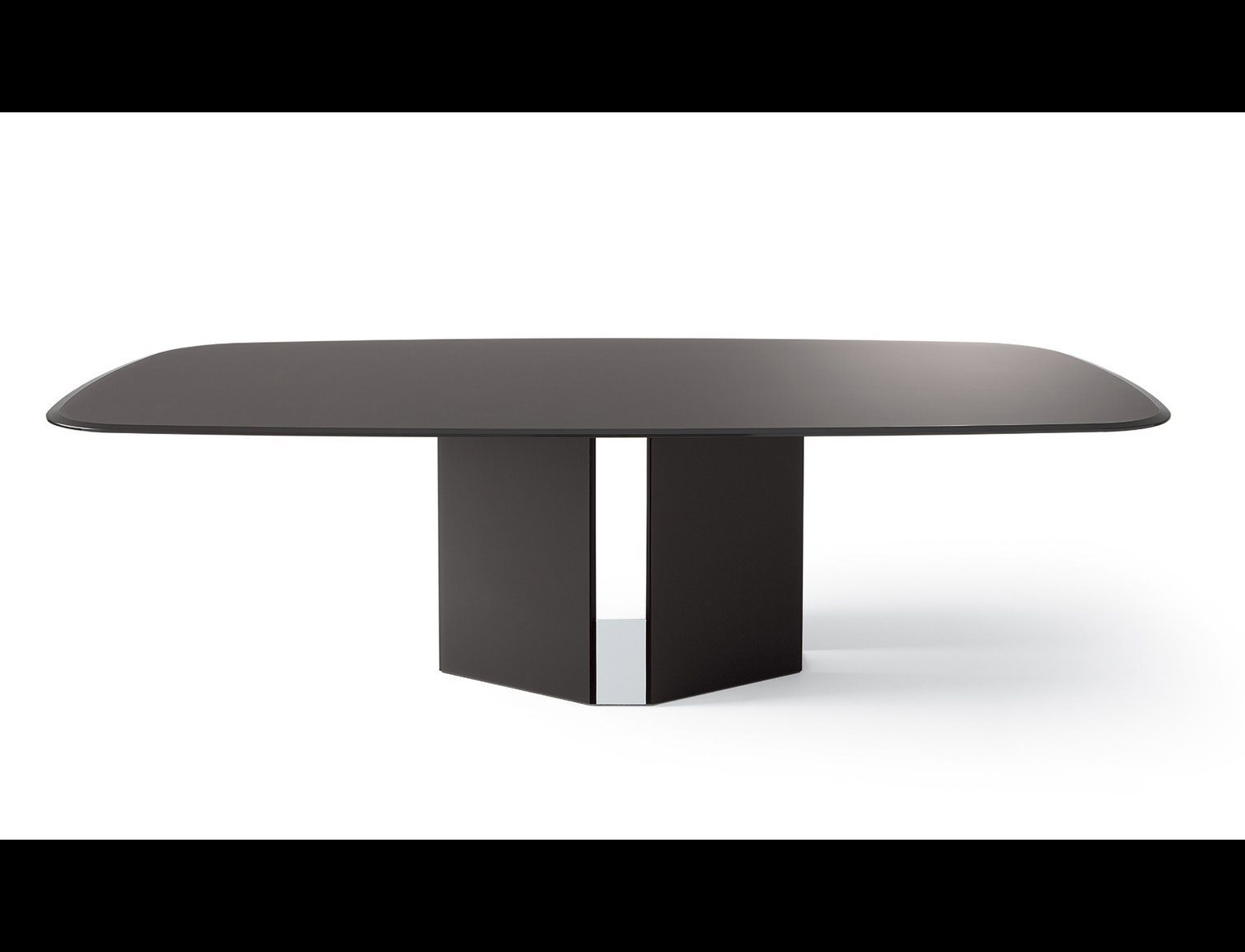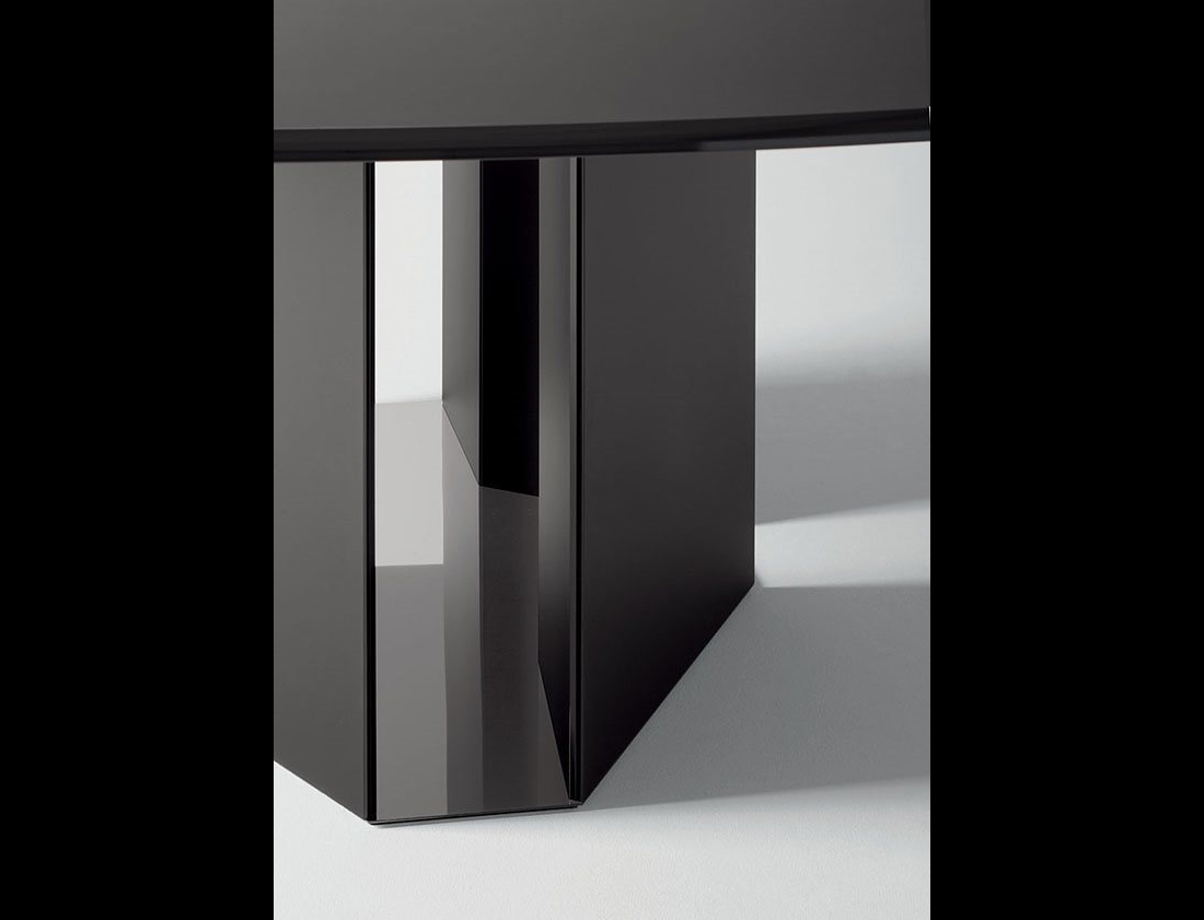 Table with 15mm painted glass top as per samples in the bright or satin version. Glass top with 25mm bevelled edge. Wooden base covered by 6mm tempered painted glass in the same finish of the top. “Supermirror” bright stainless steel metal parts.