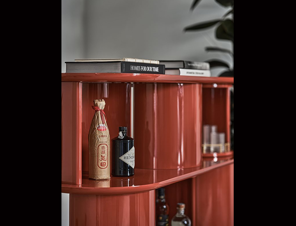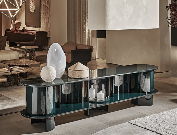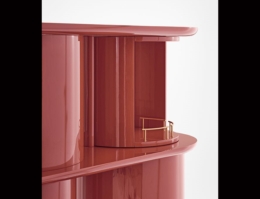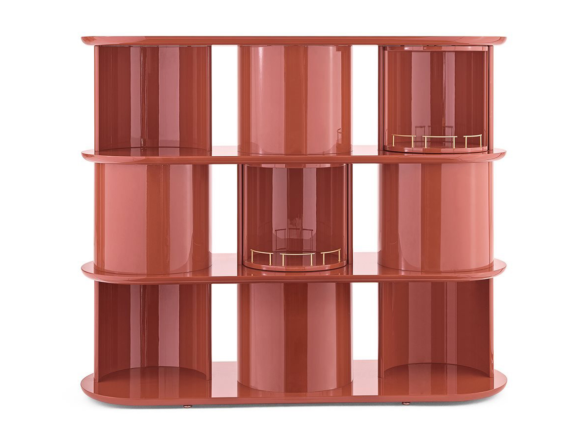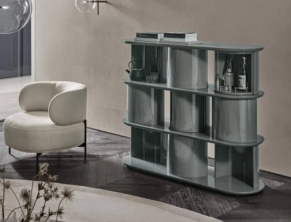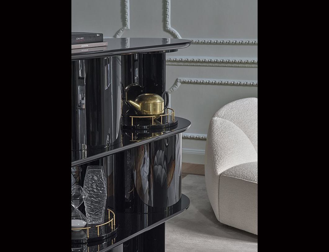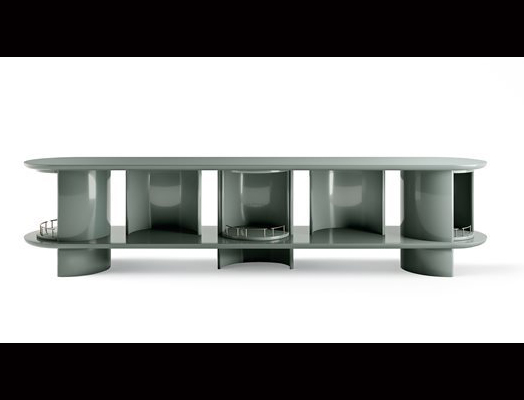 Sideboard with structure, shelves and half-cylinder in glossy or opaque lacquered wood.