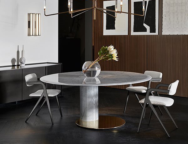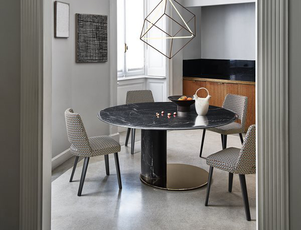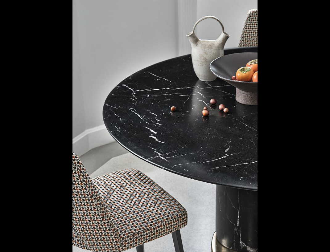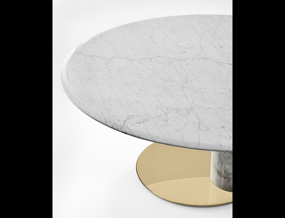 Table with top and base in natural polished Bianco Carrara Gioia marble or honed mat Nero Marquinia marble. Glossy brass-plated metal bottom plate. Marble rotating plate in the same finish of the top resting on the top, on request.