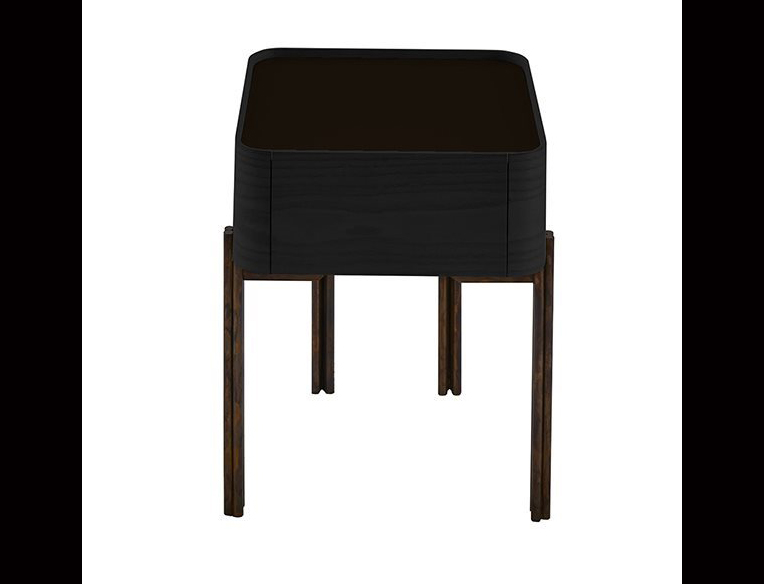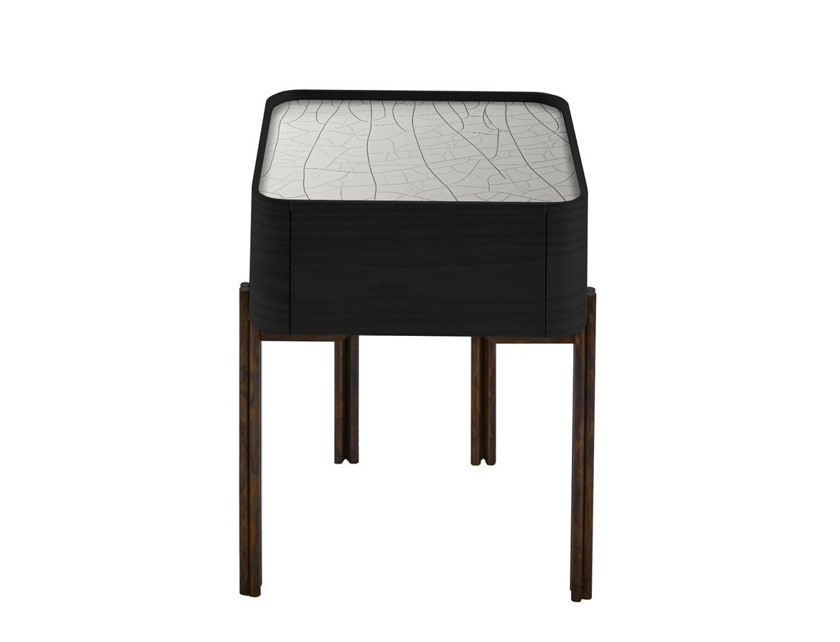 Black open pore stained ash night table. 6mm hand decorated Craquelé or bright liquorice painted glass top. Hand burnished brass structure.