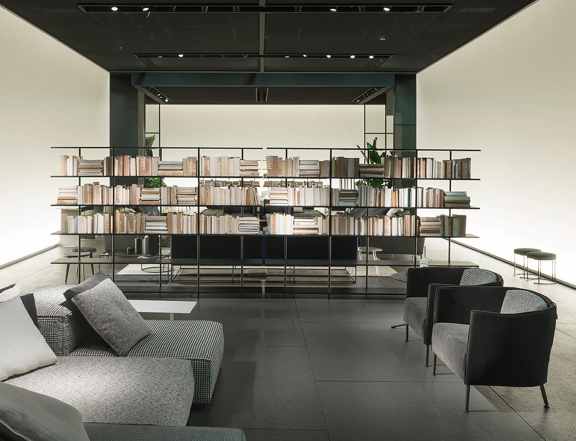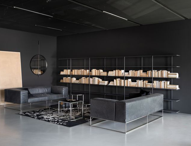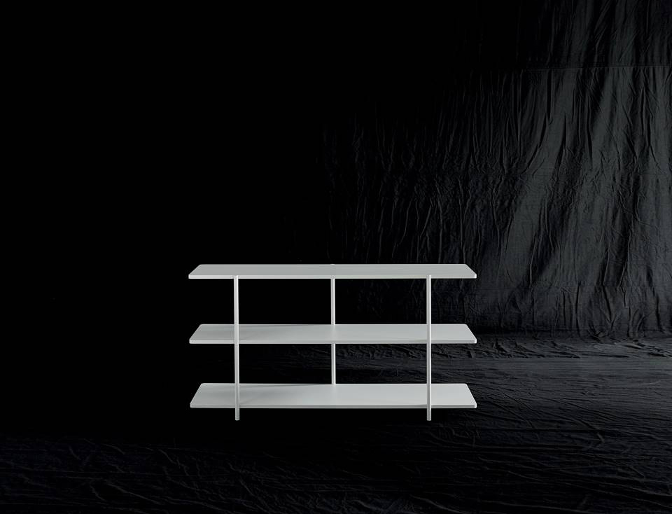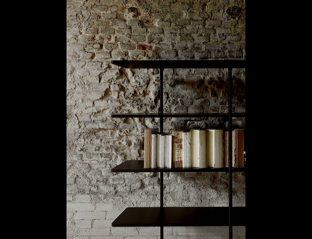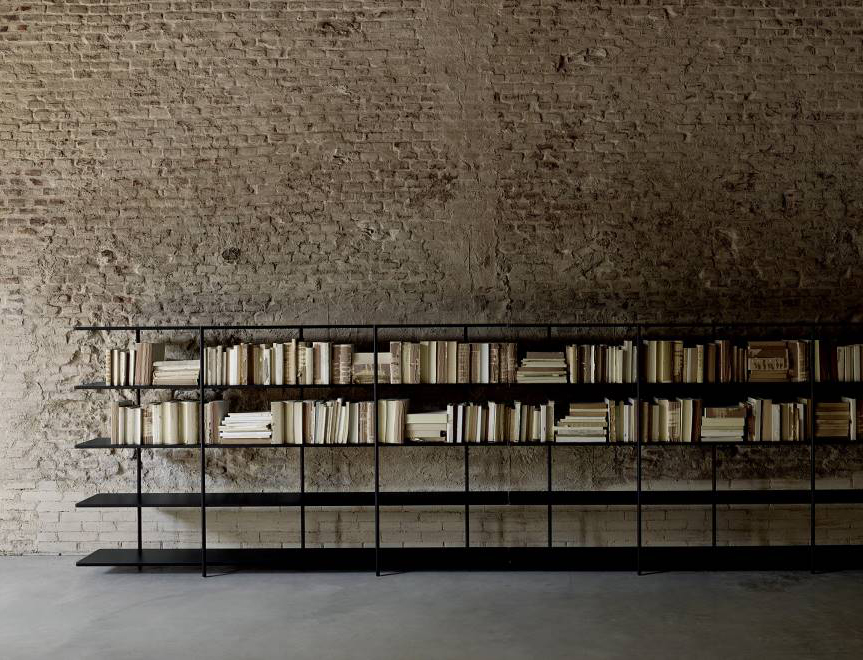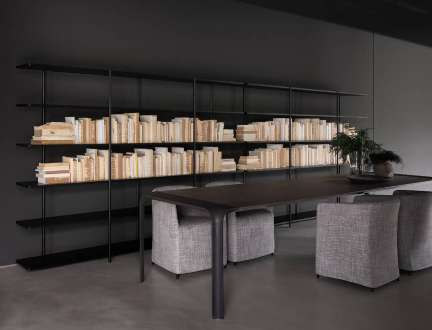 The aerodynamic shelves of Aero are supported by a set of fluctuating vertical posts as if by magic, creating a new domestic totem.