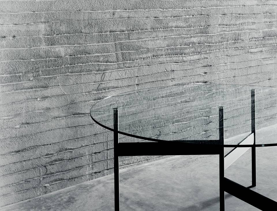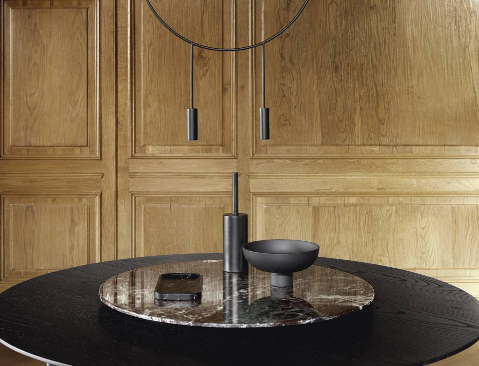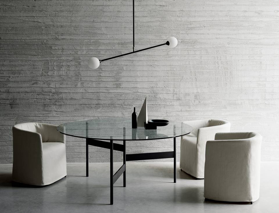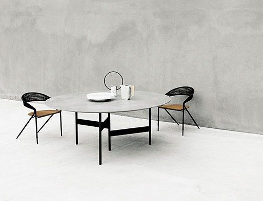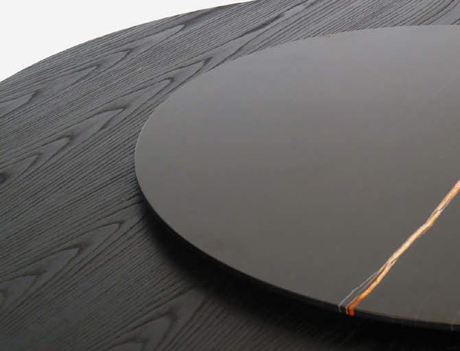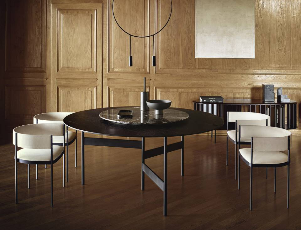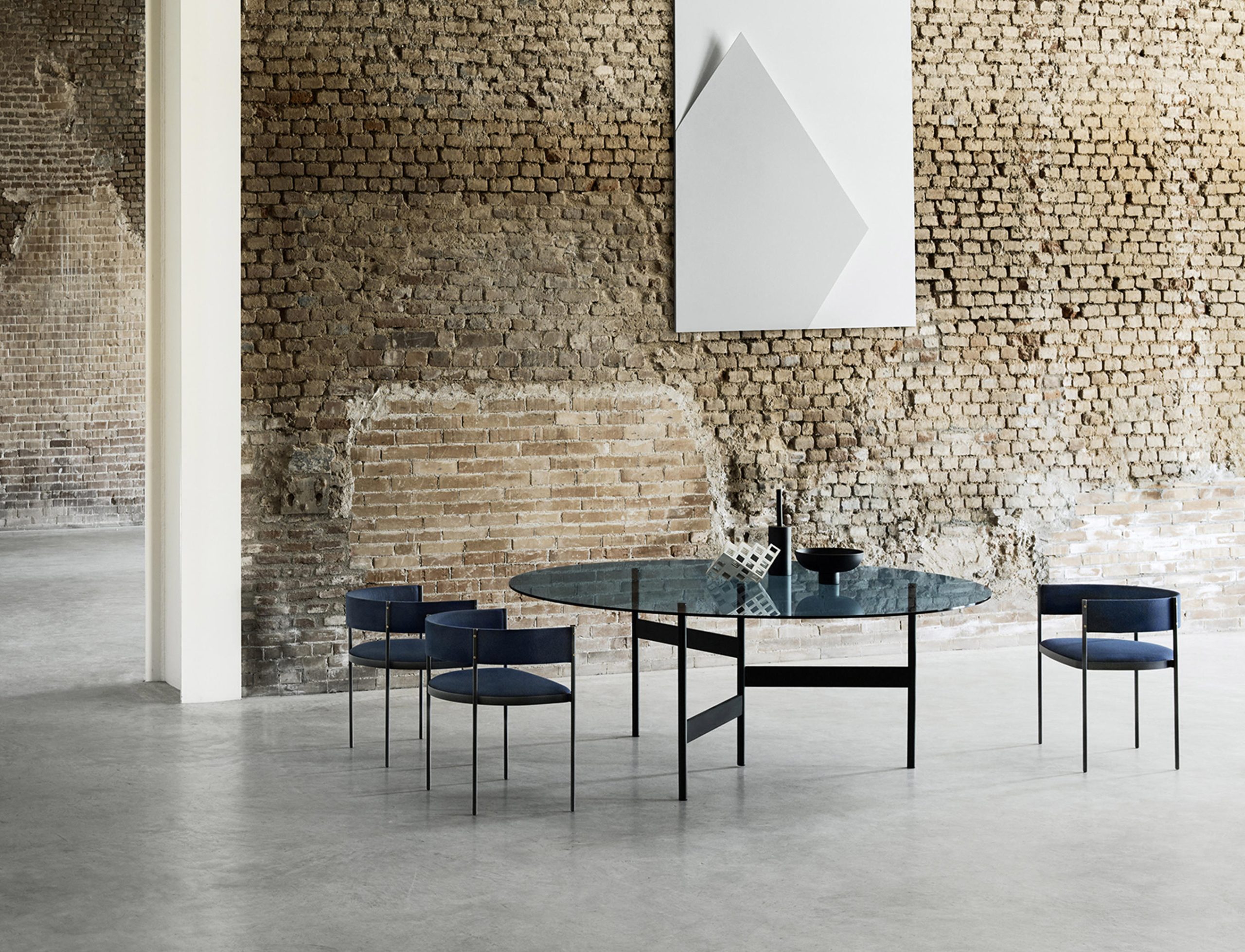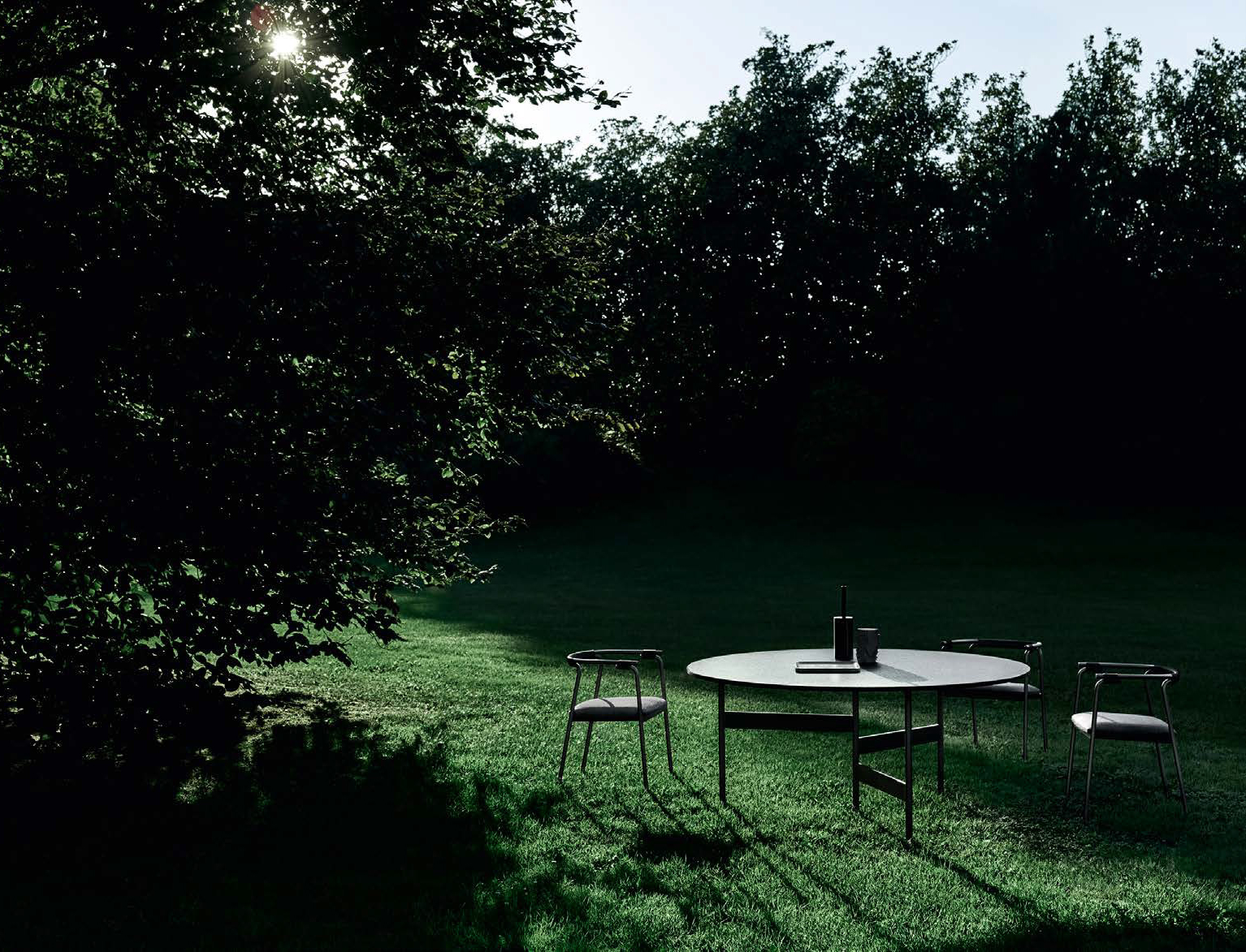 Structure of three slender legs, connected through metallic strips placed at different heights: they seem to chase each other in a graphical play that marks the rhythm of the table, offering a different perspective each time.