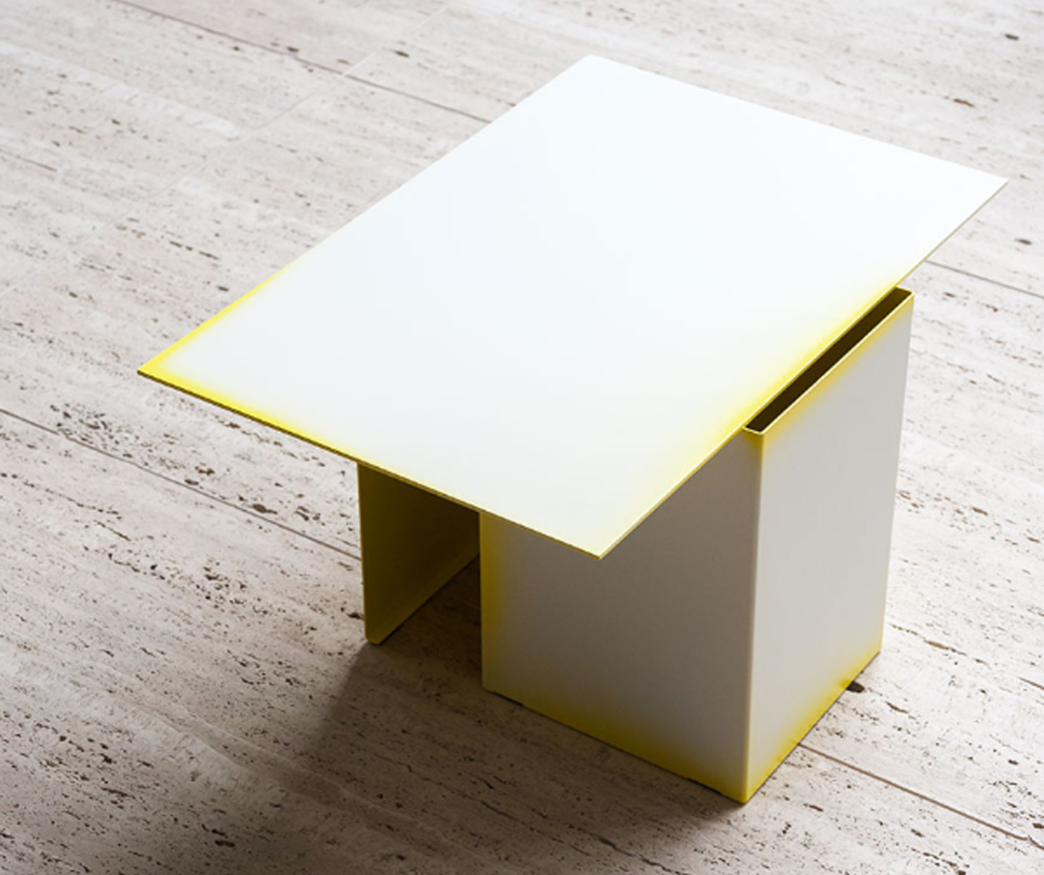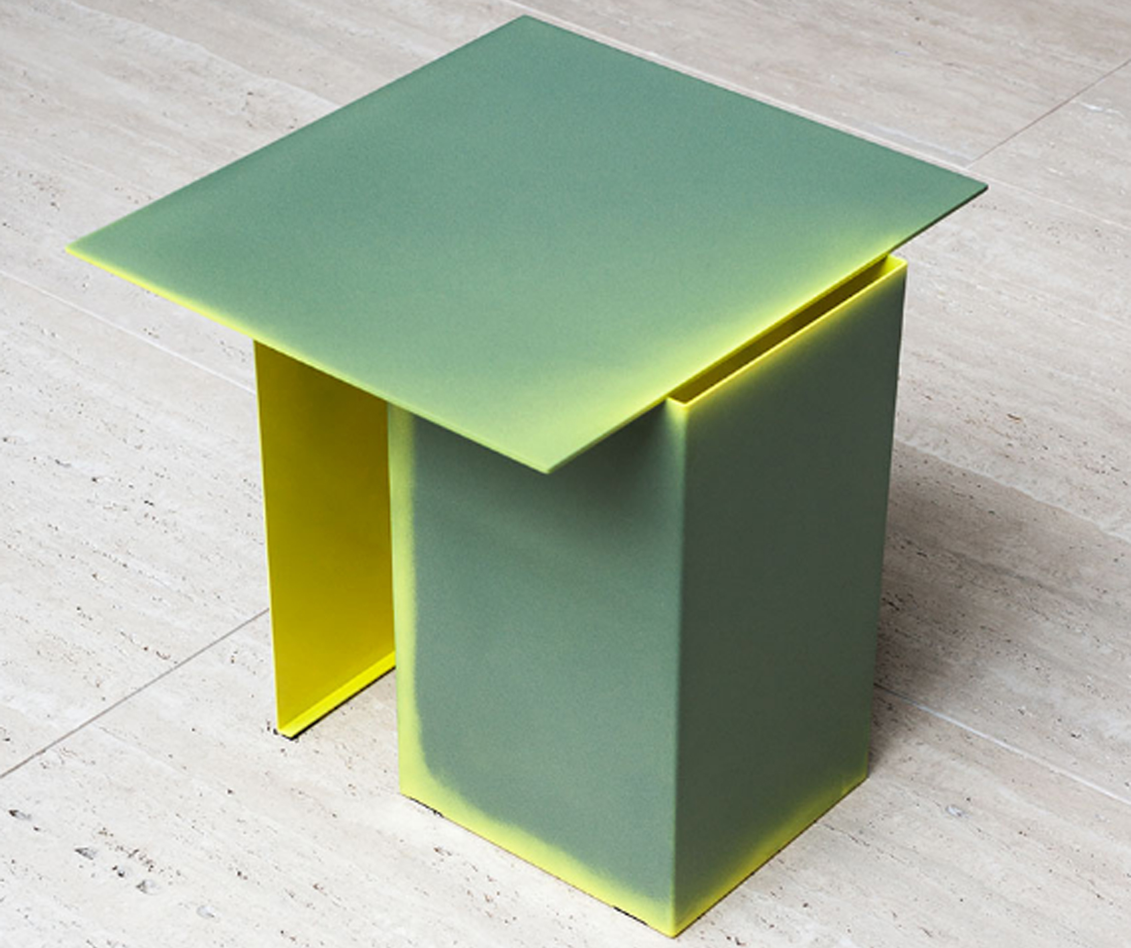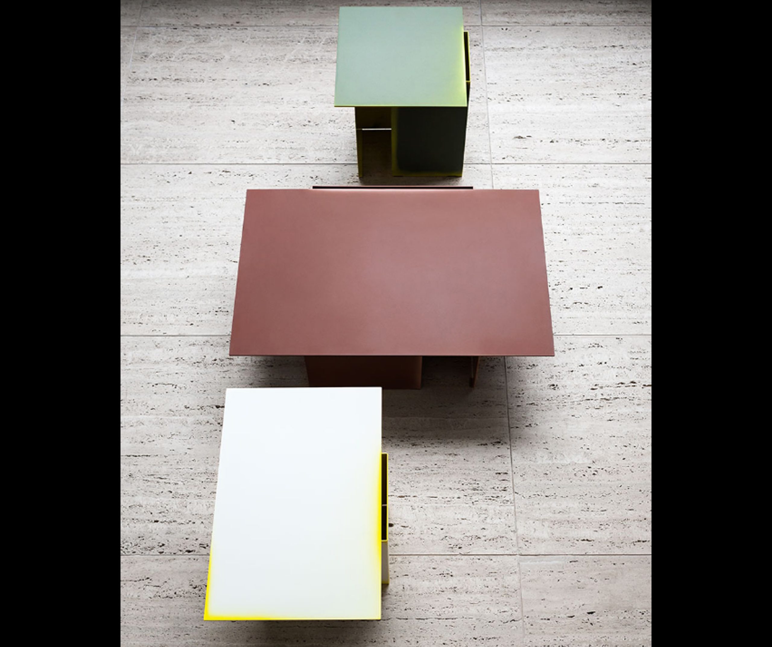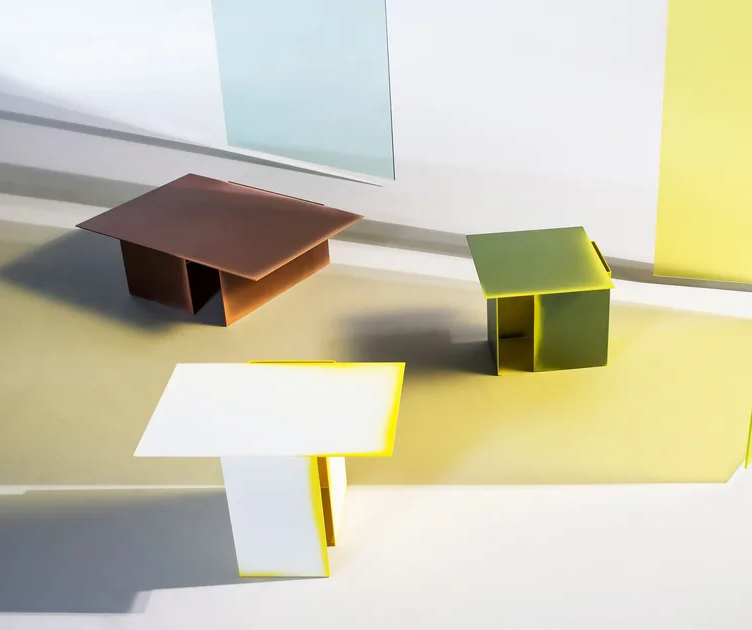Architectural shapes inspired this collection of low tables with futuristic lines by Dutch design studio Truly Truly. Made of bent and welded sheets of metal, the Daze low tables are hand colored, one by one, so that the intensity of the paint changes as it spills out of the cuts with different effects.