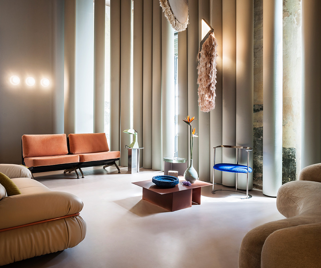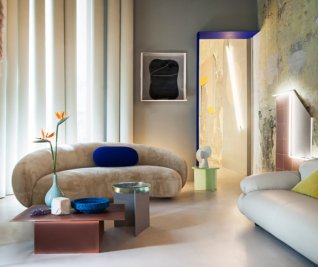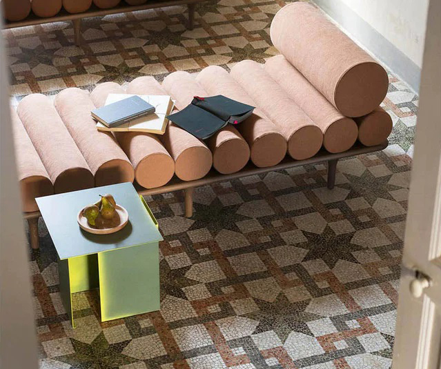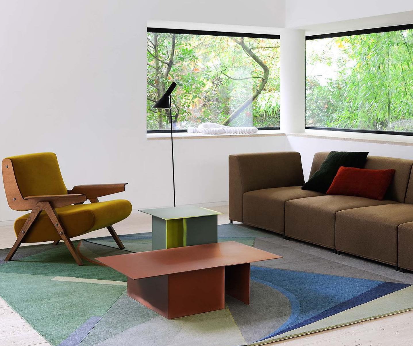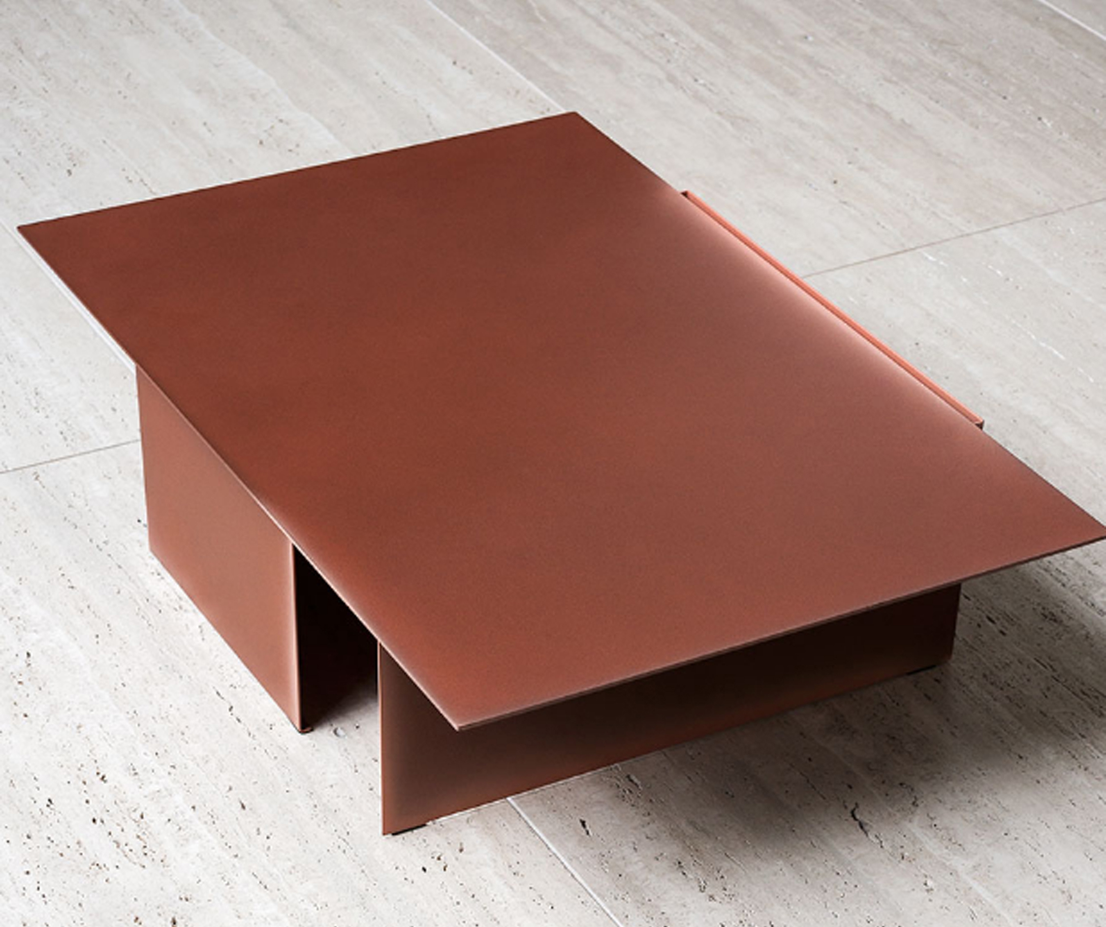 Architectural shapes inspired this collection of low tables with futuristic lines by Dutch design studio Truly Truly. Made of bent and welded sheets of metal, the Daze low tables are hand colored, one by one, so that the intensity of the paint changes as it spills out of the cuts with different effects.