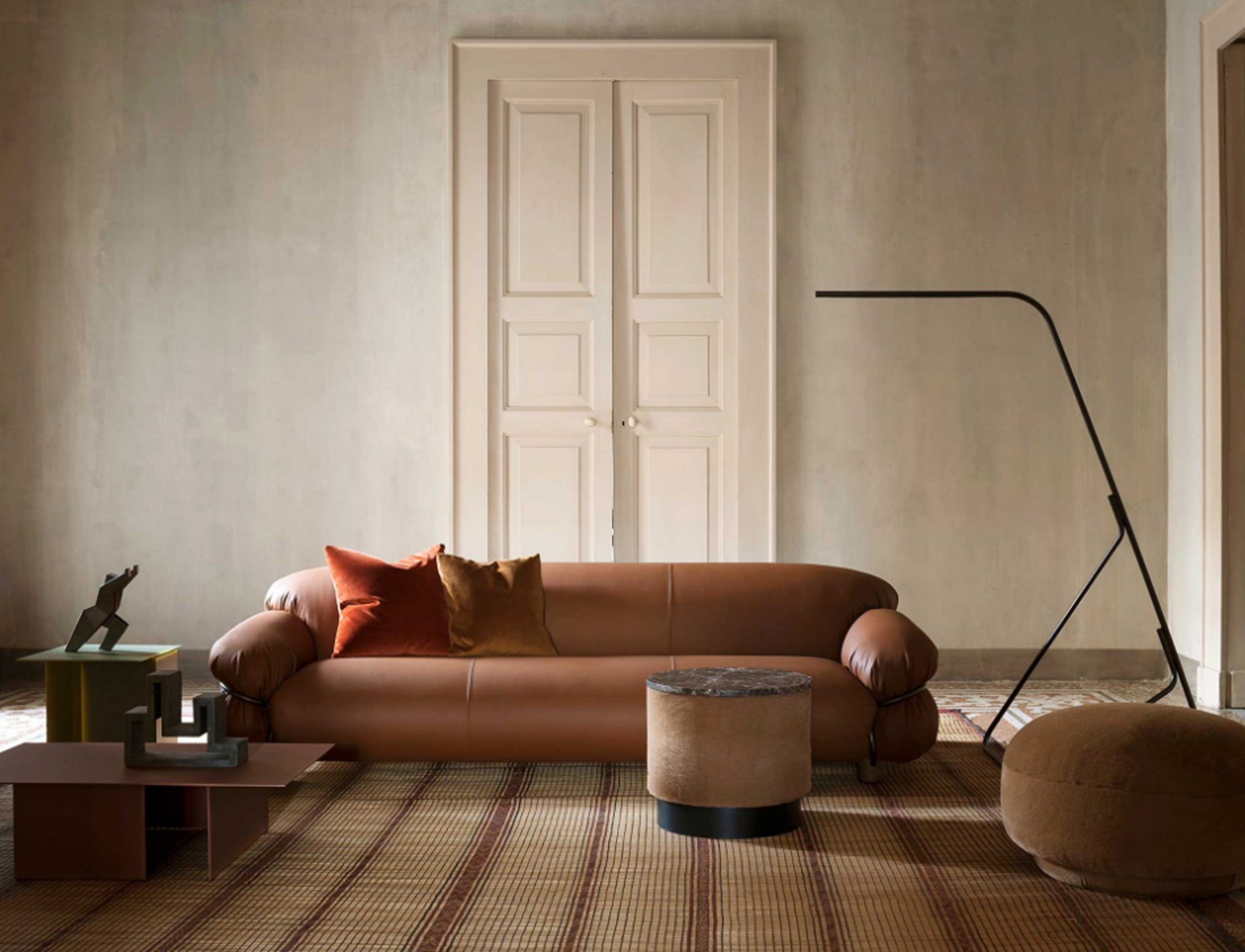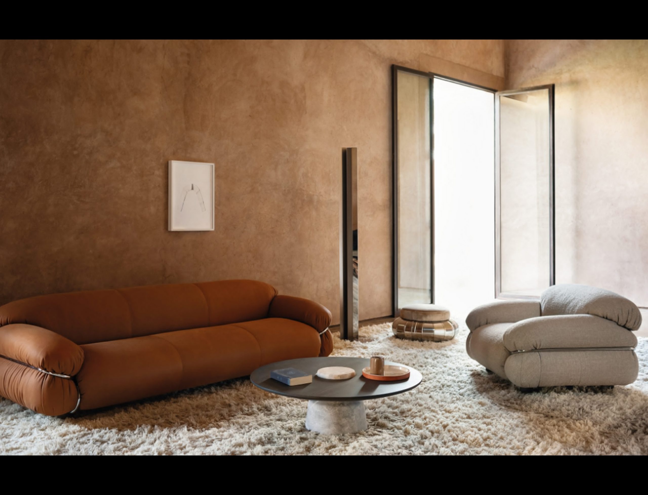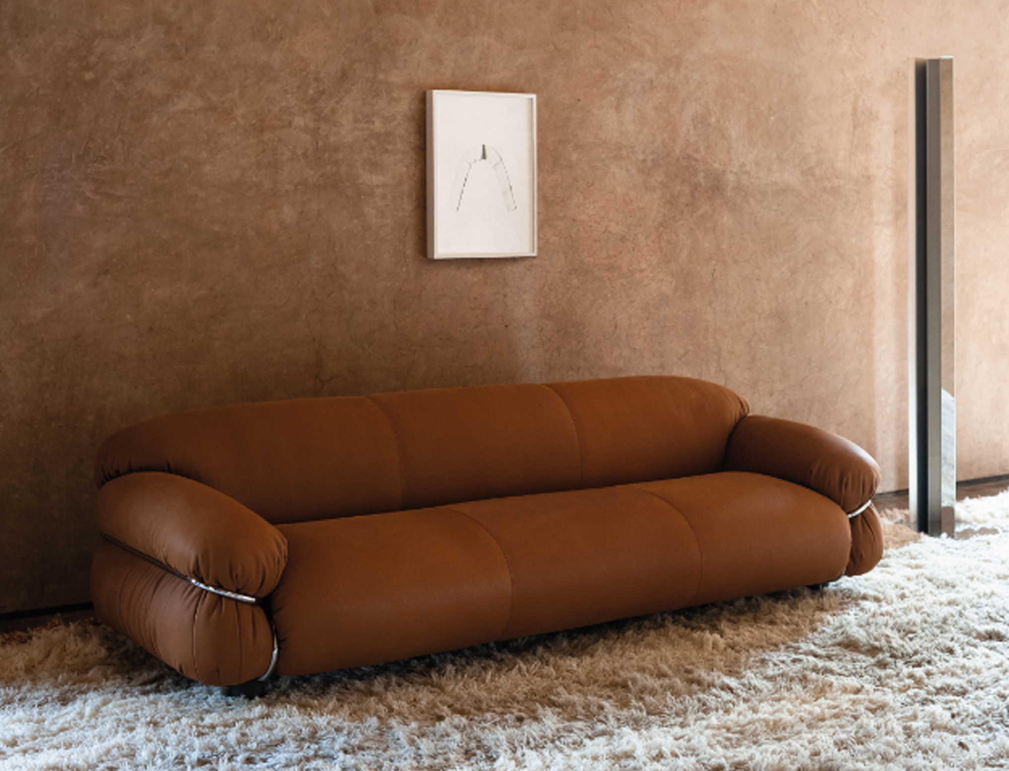 Sesann is reborn in new dimensions to offer greater comfort and sensuality with a deep and welcoming seat that further enhances the important volumes of this historic sofa.